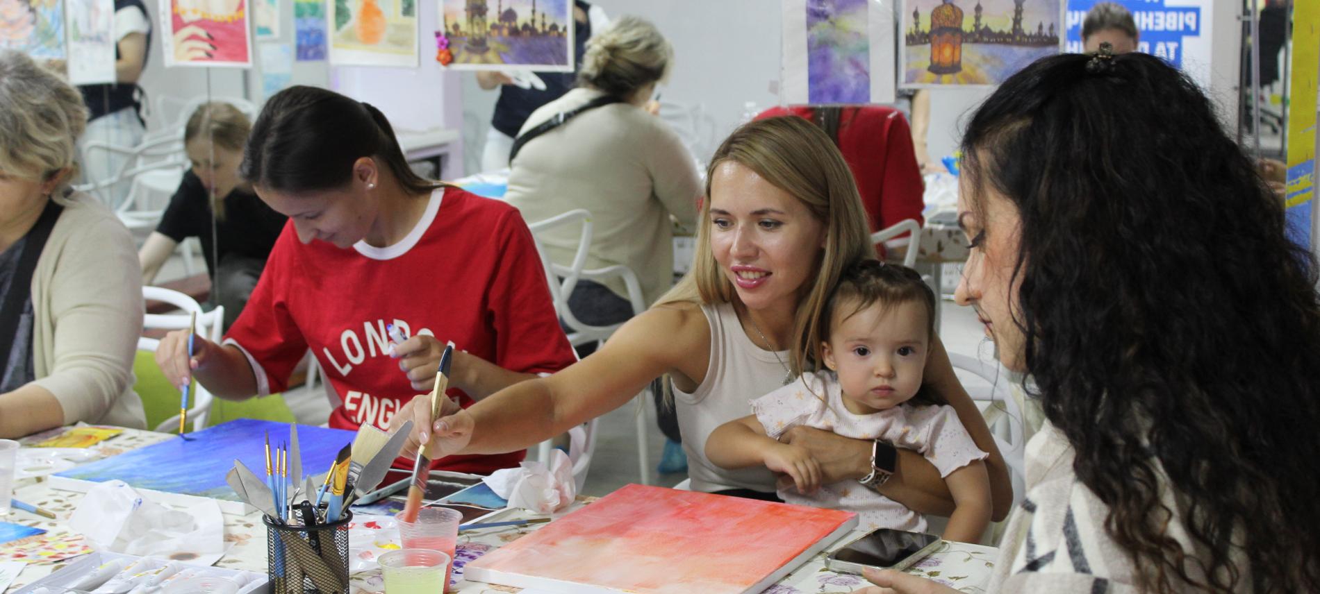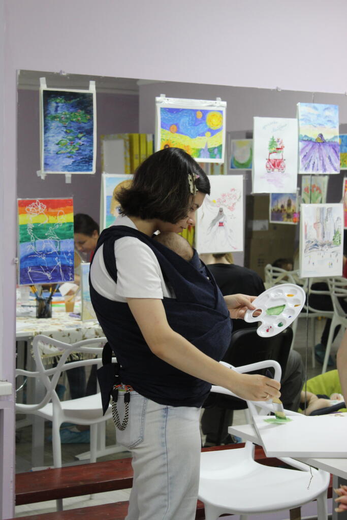 Bringing a baby into the world is full of uncertainties, even in times of peace. The physical and hormonal changes that accompany pregnancy have a significant impact on mental health—and the mother’s well-being directly affects the child. Doctors of the World offers a series of workshops aimed specifically at pregnant and breastfeeding individuals. In one such workshop, participants painted so-called affirmation pictures—landscapes and color compositions in vibrant tones, some featuring positive messages. The workshops provide a space where women can relax and freely express their feelings and creativity.
